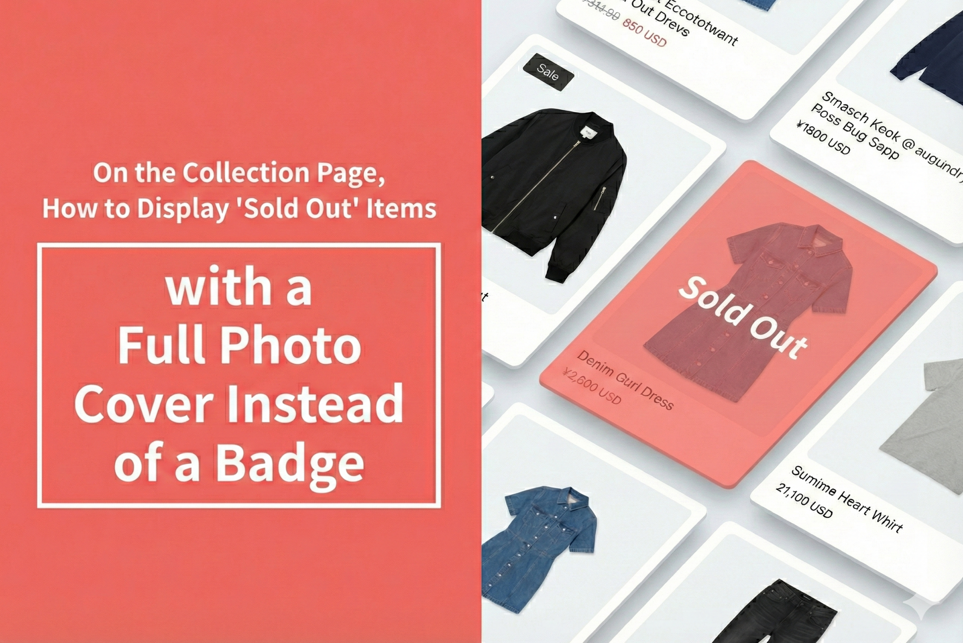 An example of how to display "sold out" products on the collection page of the Shopify theme "Rise/Dawn" by covering the entire photo instead of using a badge.