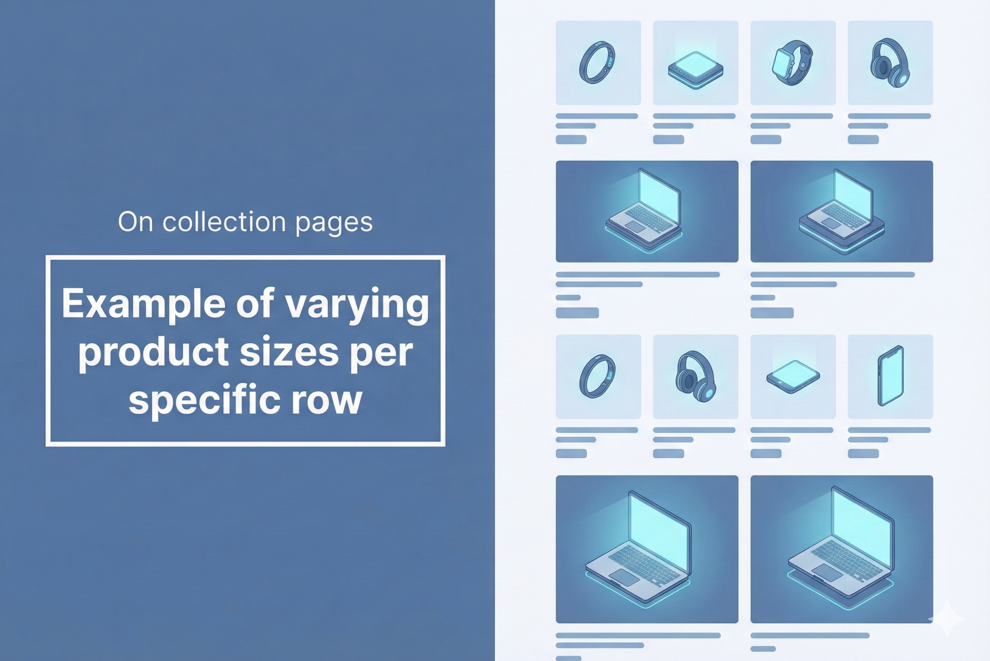 Varying product sizes on specific rows can add visual interest and make your store more appealing.