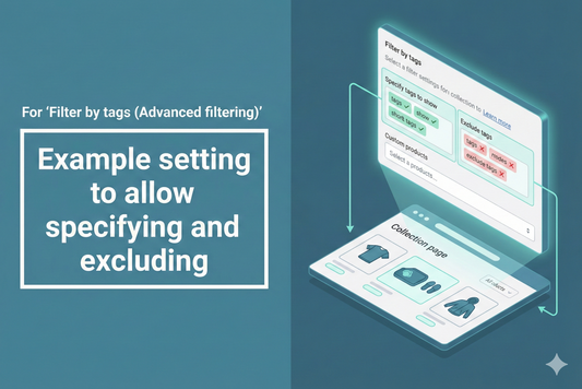 ◆Specific setting steps ① Add a scheme to "sections/main-collection-product-grid.liquid" and a label to "ja.schema.json" ② Add an argument to "sections/main-collection-product-grid.liquid" to pass the tag list specified in the filter setting snippets ③ Load the tags to be excluded in "snippets/facets.liquid" and add exclusion processing to the filters for desktop and mobile drawers