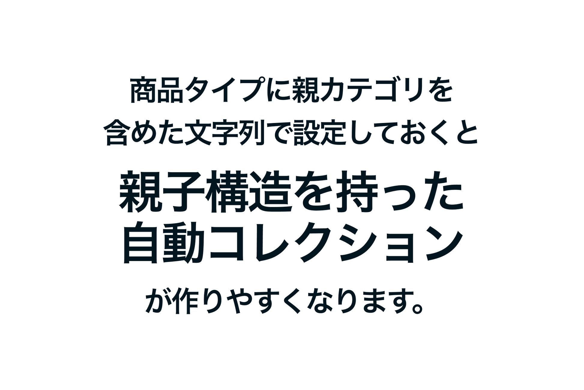 商品情報を登録する際、ショッピング広告用に「商品カテゴリ」はリスト選択したものを設定しますが、商品タイプに親カテゴリを含めた文字列で設定しておくと、親子構造を持った自動コレクションが作りやすくなります。