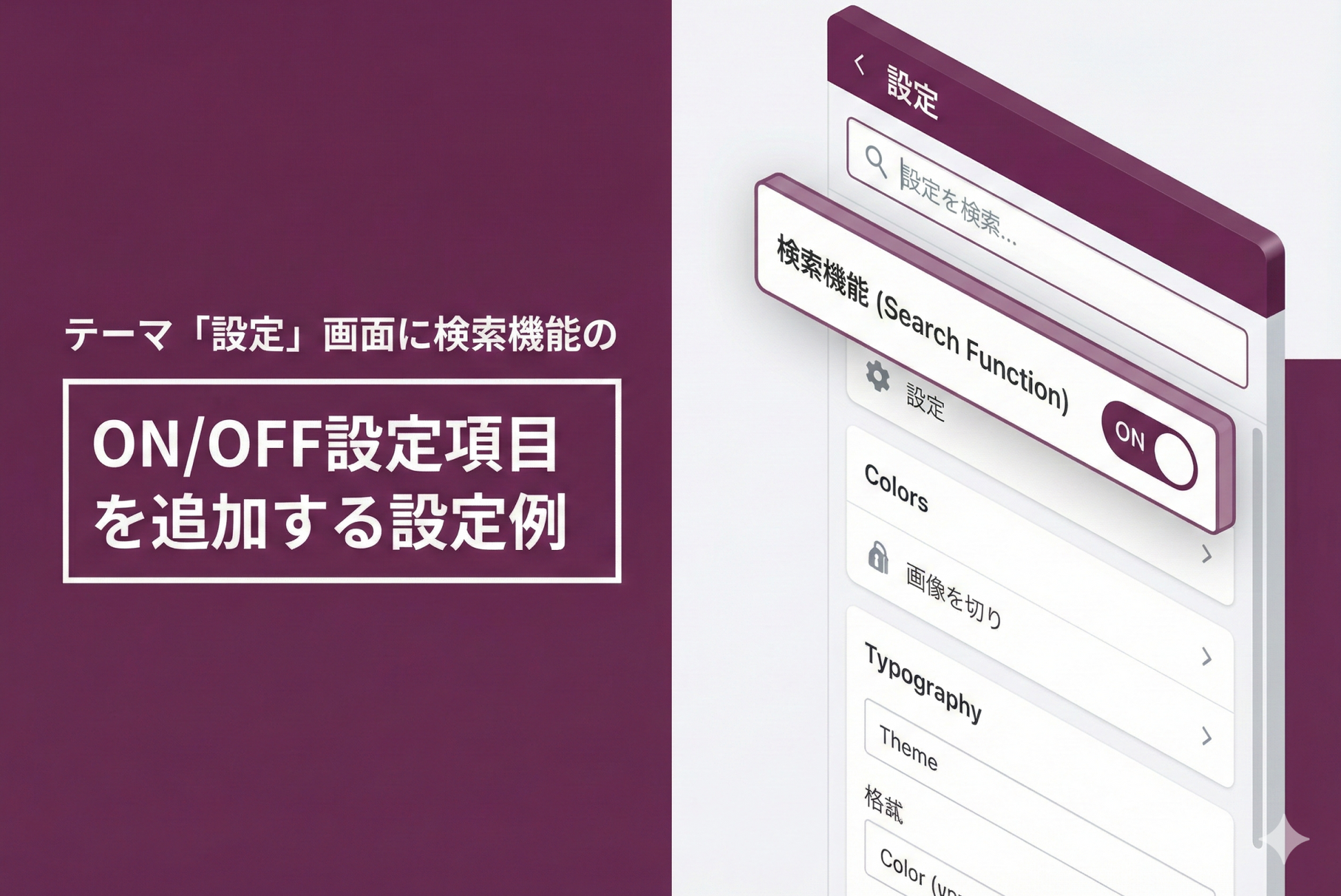 Shopifyのテーマ「Rise/Dawn」のテーマ「設定 」画面に検索機能のON/OFF設定項目を追加する設定例