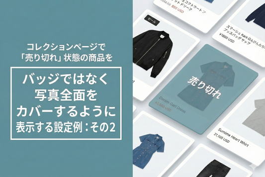 Shopifyのテーマ「Dawn/Rise」のコレクションページでは売り切れ商品はバッジでマーキングされますが、より目立たせるために写真全体をカバーする形で表示する設定例です。