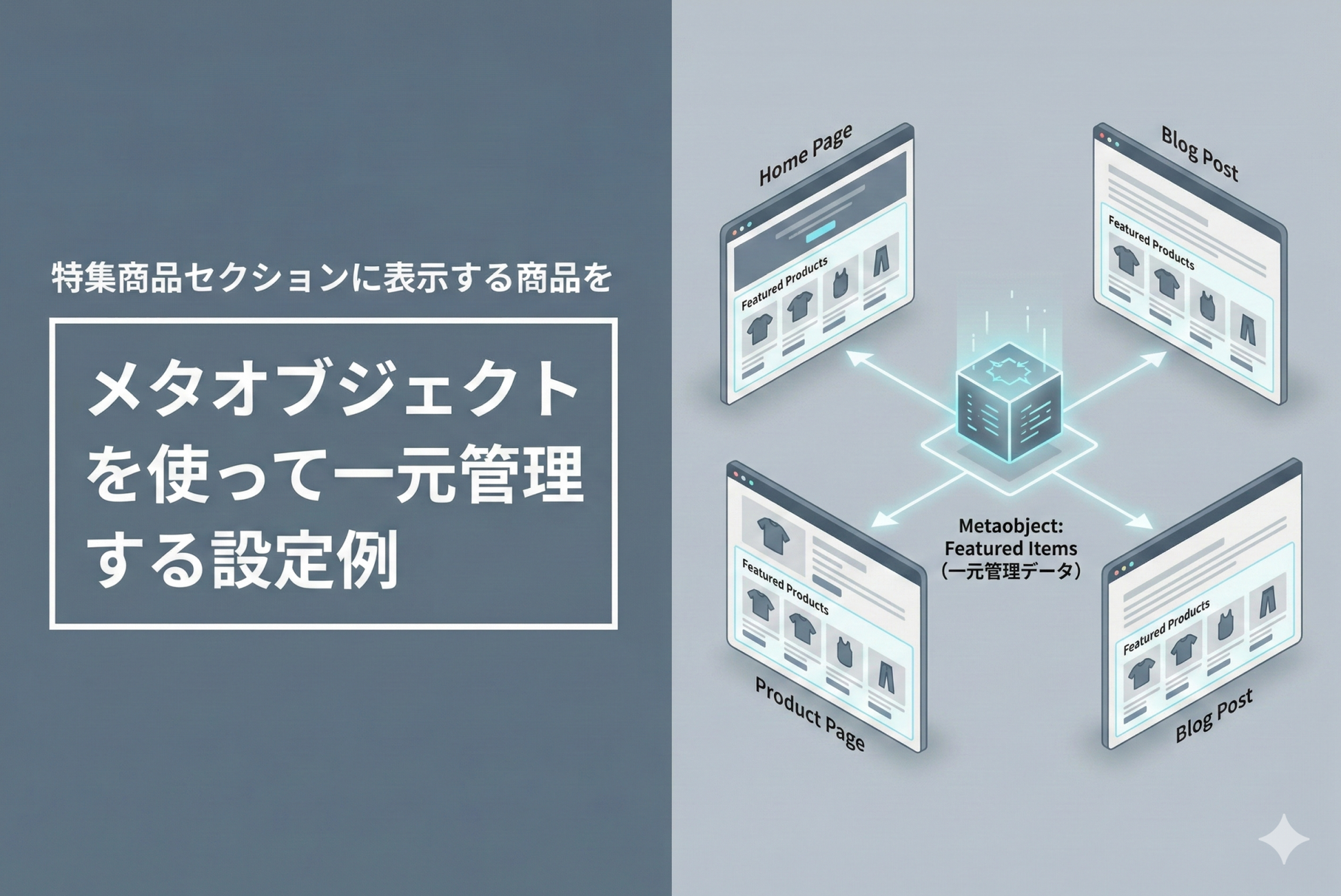 Shopifyのメタオブジェクトを使うことで複数のページに配置されたセクション情報を一元管理することができます。例えば特集商品セクションの参照先商品をメタオブジェクトにしておけば、メタオブジェクトの中身を切り替えるだけで全ページの内容を更新できるようになります。
