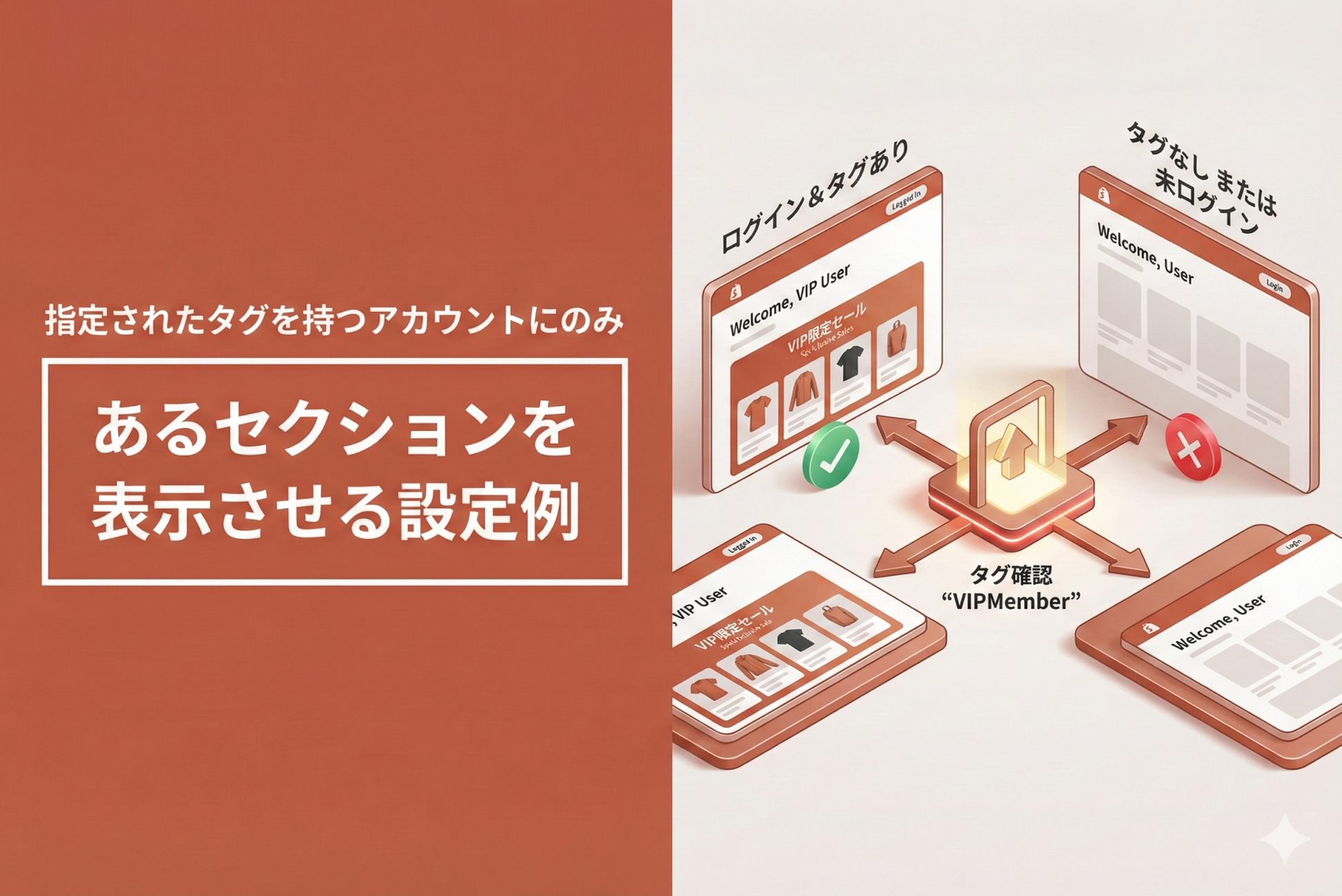 Shopifyテーマのセクションについて、「特定のタグを持つ(または持たない)アカウントにのみ表示」という設定項目を追加することによって、条件に合致する顧客がストアにログインしている時だけ表示されるようにする場合の設定例です。