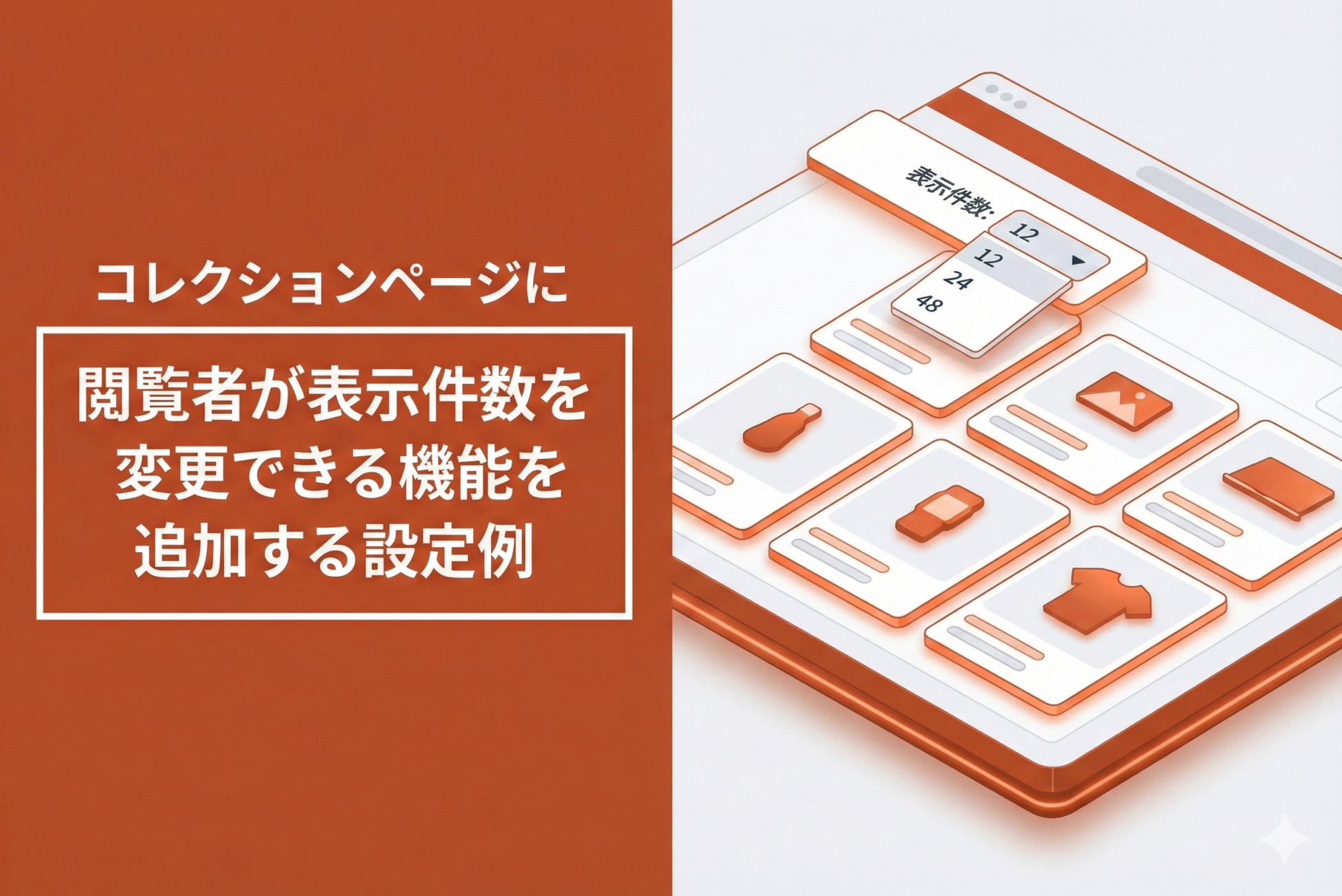 Shopifyのテーマ「Dawn/Rise」のコレクションページで、1ページあたりの表示件数をストアフロント側で変更できるようにする設定例です。変更した表示件数は、同じテンプレートを使用するコレクションで、購入完了するまで維持されます。