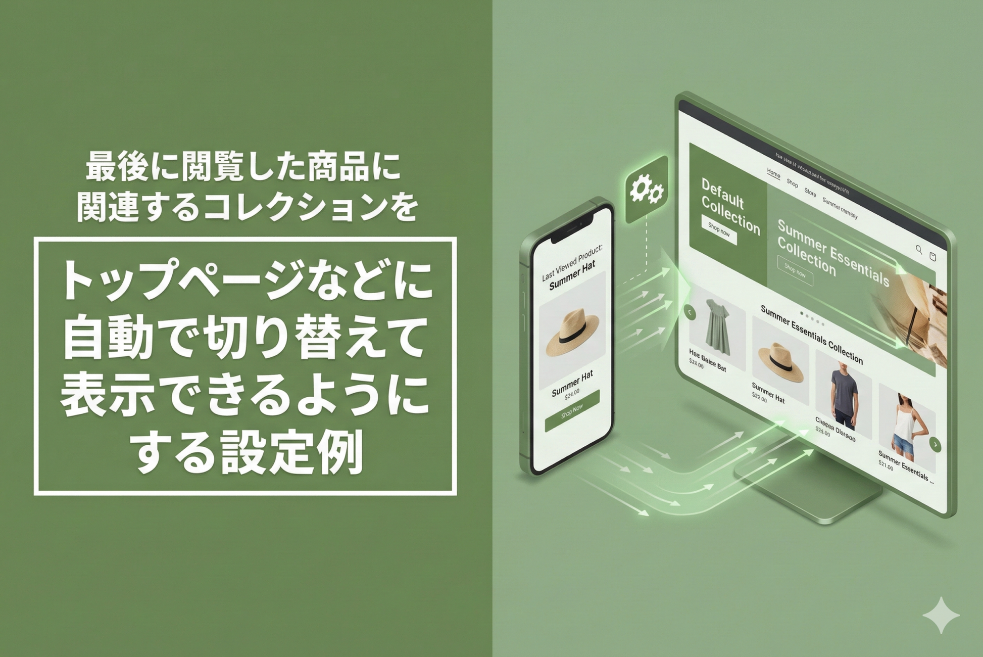 テーマ「Dawn/Rise」で、最後に閲覧した商品の関連コレクションをトップページなどで自動で切り替えて表示できるようにする方法です。