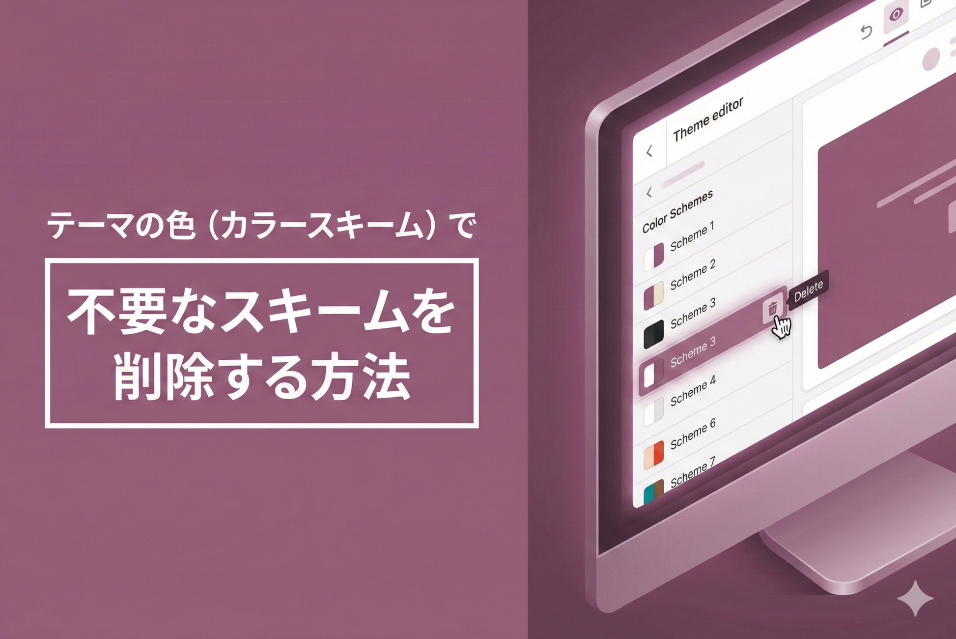 Shopifyのテーマ設定画面で任意に追加することができるカラースキームですが、誤って操作するなどして不要なカラーが増えてしまったときは、「テーマ編集」から「config/settings_data.json」を開き、該当の項目を削ることで削除できます。